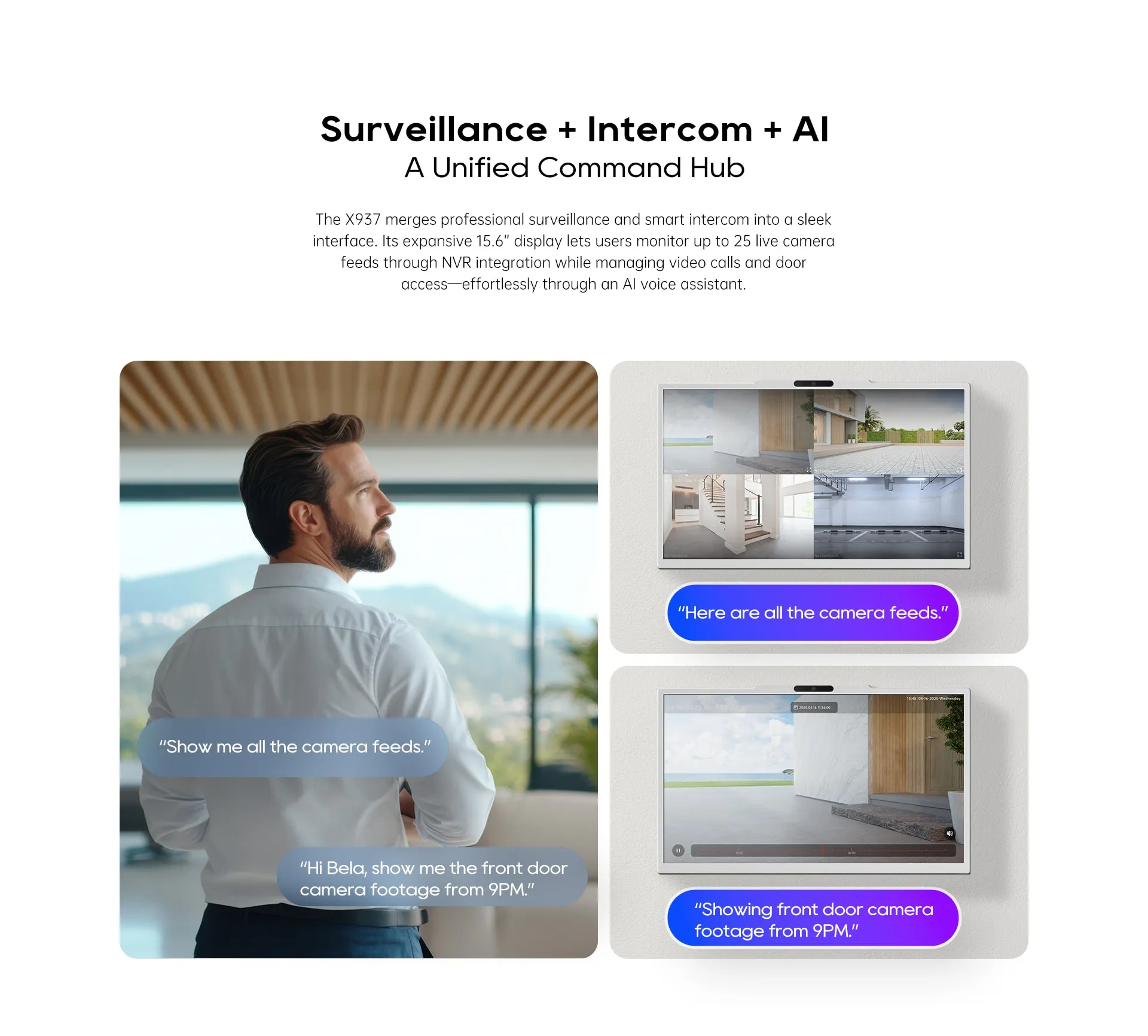 The Akuvox X937 is a powerful 15.6″ touchscreen monitor with an embedded AI assistant, letting you monitor up to 25 live cameras feeds through NVR integration and control your smart home using only your voice. It’s also Google GMS certified, letting you download apps directly from the Google Play Store so you can enjoy music streaming, smart home integration, and more.