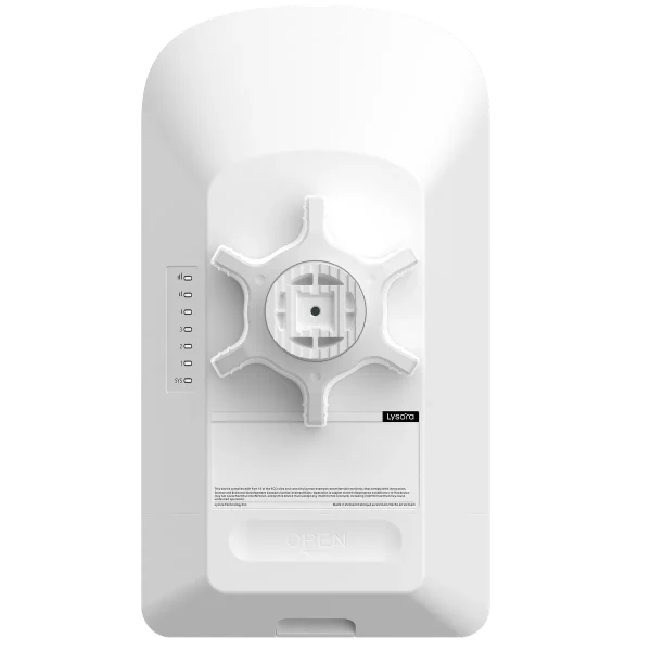 The Lysora CPE5 is a wireless bridge with gigabit ports, supporting full bandwidth 10/100/1000 Mbps data transmission across distances of up to 5 km. They are sold in pre-paired kits for easy installation, but can be paired with up to 5 transmitters for point-to-multipoint connectivity.