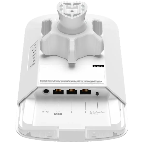 There’s a reset button on the back, which will restore the device to factory default settings after being held for 10 seconds. If you hold it for two seconds, it will quickly pair nearby Lysora wireless bridges to the same network, saving you lots of time when it comes to setting up point-to-multipoint networks.