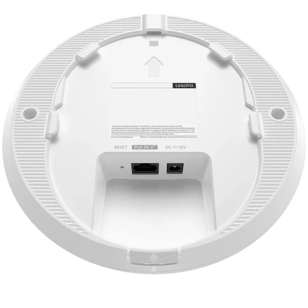 The Lysora L6Lite is a Wi-Fi 6 ceiling-mounted access point, designed for low to medium-density applications. It supports up to 256 users, with a maximum bandwidth of 1774 Mbps between the 2.4 GHz and 5.8 GHz channels. There are 4 spatial streams with a coverage area of 125 m² (1345 ft²).