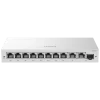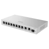 This is a 8-port managed PoE switch with two uplink ports and one SFP port. It supports PoE+ of power on the eight main ports, up to a total PoE budget of 120 W. It also has layer-2 features such as VLAN configuration, DHCP snooping, and rebooting individual PoE ports.