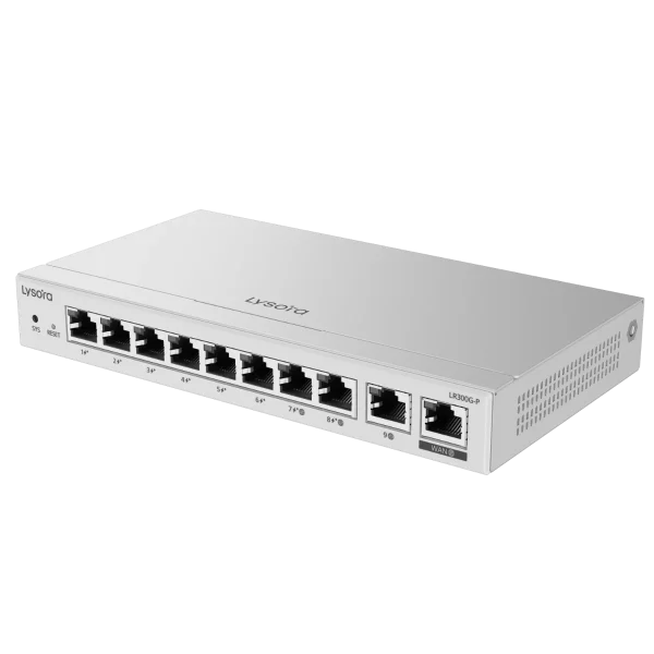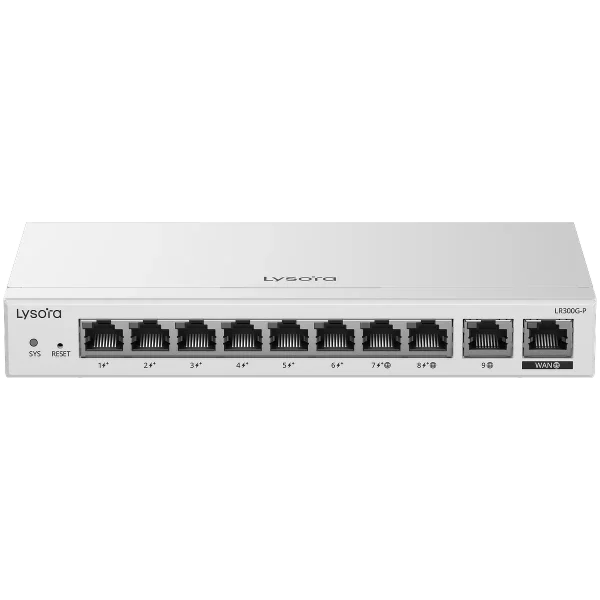 The Lysora LR300G-P is a 10-port Gigabit router with 8 PoE+ ports (110 W power budget) and support for multi-WAN connections. It also supports popular VPN protocols such as OpenVPN and Wireguard, allowing you to connect to your home or office network securely from a remote location.